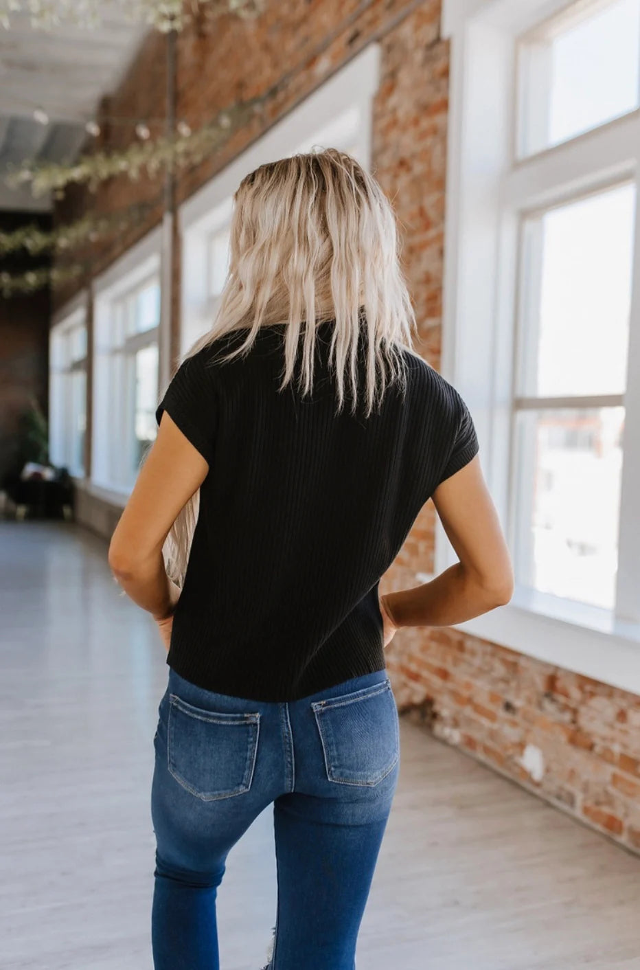 Stasia High Neck Short Sleeve Sweater – Elegant black knit top with a classic high neckline and soft, breathable fabric. A versatile wardrobe essential, perfect for layering or wearing alone in spring, summer, and fall for a chic, timeless look.